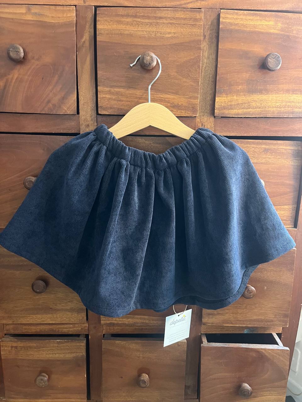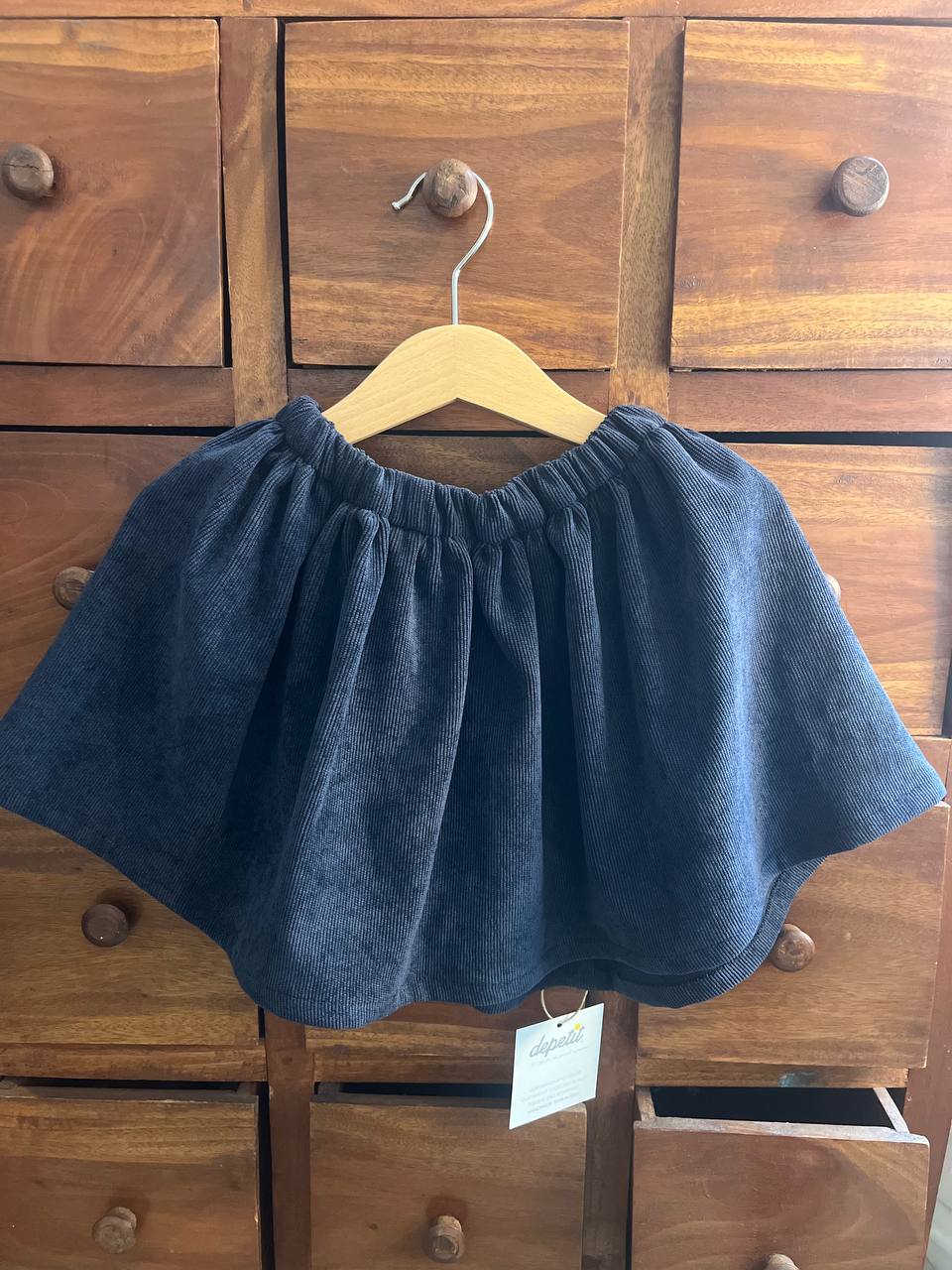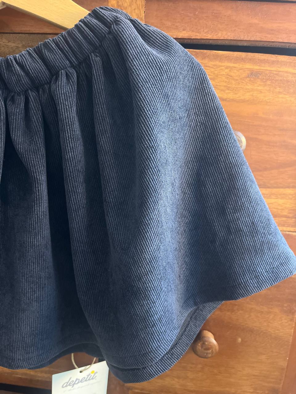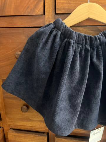 La nostra Gonna SKY è realizzata in morbido velluto millerighe di un intenso colore blu notte (o blu scuro, a seconda della tonalità esatta). Questo tessuto offre una texture ricca e un calore ideale per le giornate più fresche.